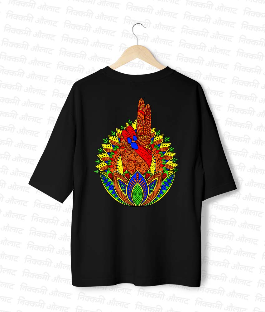 Find your calm and balance with the ‘Vata Naashak Mudra Mandala’ Oversized T-Shirt. This unique and thoughtful design centers around the Vata Naashak Mudra—a sacred hand gesture in yoga believed to calm the mind and reduce restlessness—framed within a serene mandala.