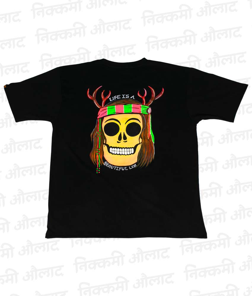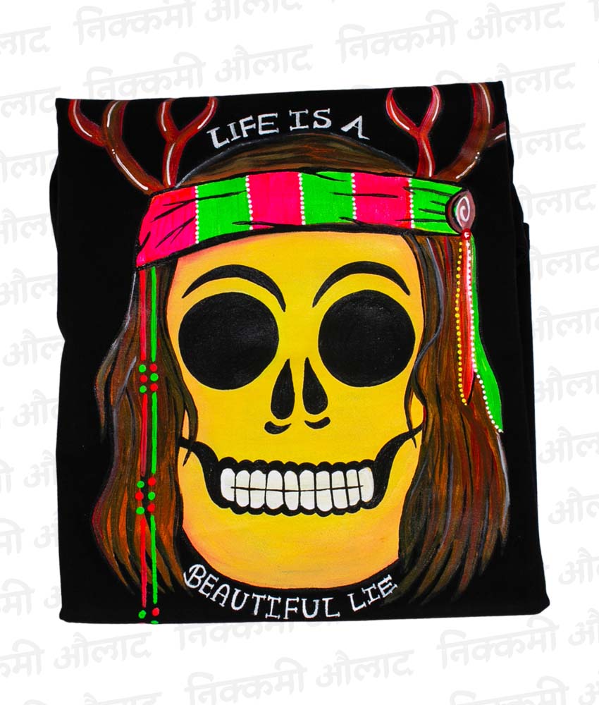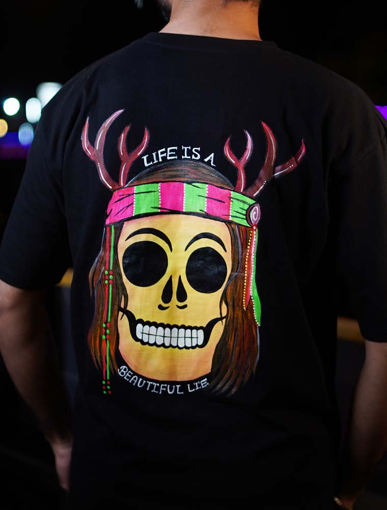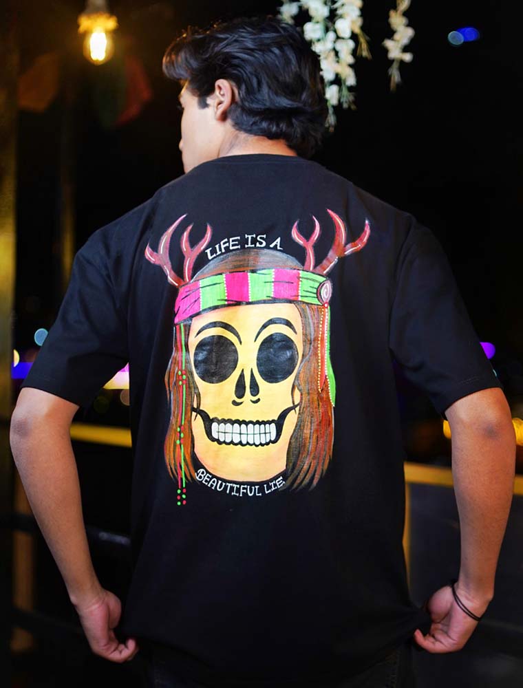 A beautiful paradox, painted by hand. The ‘Life is a Beautiful Lie’ Hand-Painted T-Shirt is a thought-provoking piece for the modern philosopher. Each shirt is a unique creation, blending a profound statement with the intimate touch of handcrafted art.