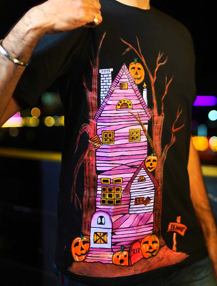 Embrace the spooky season in style with the ‘Haunted House’ hand-painted tee. A one-of-a-kind piece of wearable art by Jyoti Joshi, each with its own unique, ghostly charm.