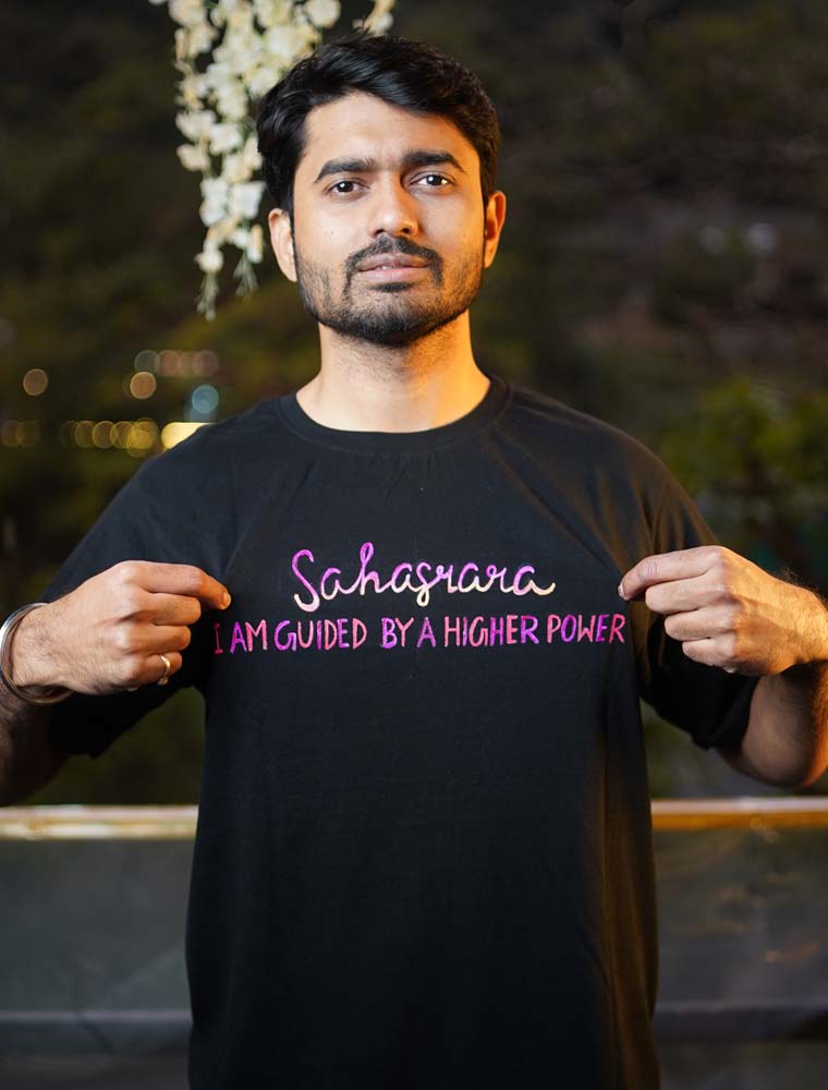 Connect to the cosmos with the ‘Sahasrara’ hand-painted tee by Jyoti Joshi. A one-of-a-kind piece dedicated to the Crown Chakra, your bridge to the universal consciousness.